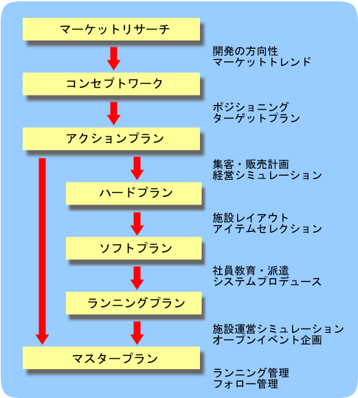 業務詳細 ■事業開発計画 ・新規事業開発および、リニューアル事業 ・地域振興施設 ・フィットネス・スポーツ施設 ・企業内施設 など ■調査研究 ■事業推進計画 ■業務委託 |