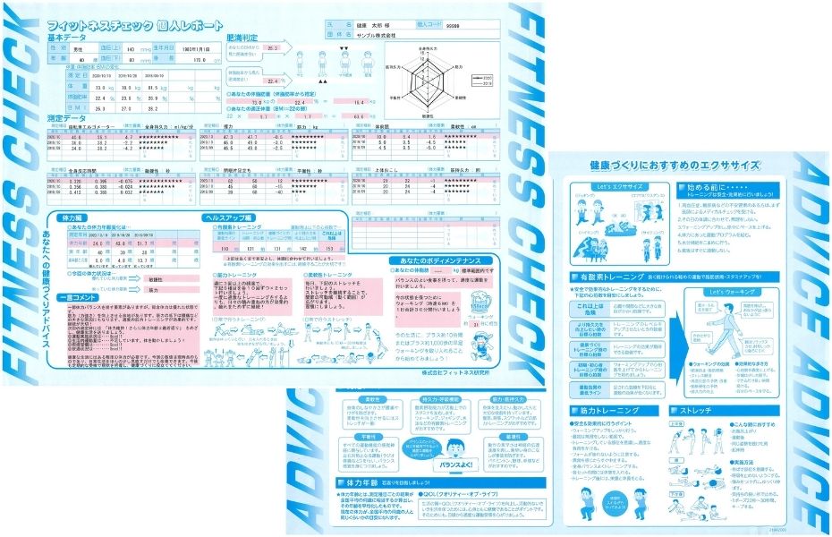 総合的な体力の状態を評価した体力年齢など、専門的な知識のない人にもわかりやすいようにしております。